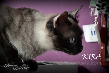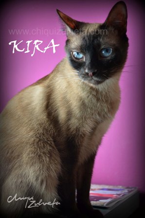 Conchi, su mami de acogida, que ya tiene otras dos siamesas no quiere que Kira salga de su vida y de la de sus «niñas», normal y lógico, Kira es una gatita estupenda y se ha adaptado fenomenal.